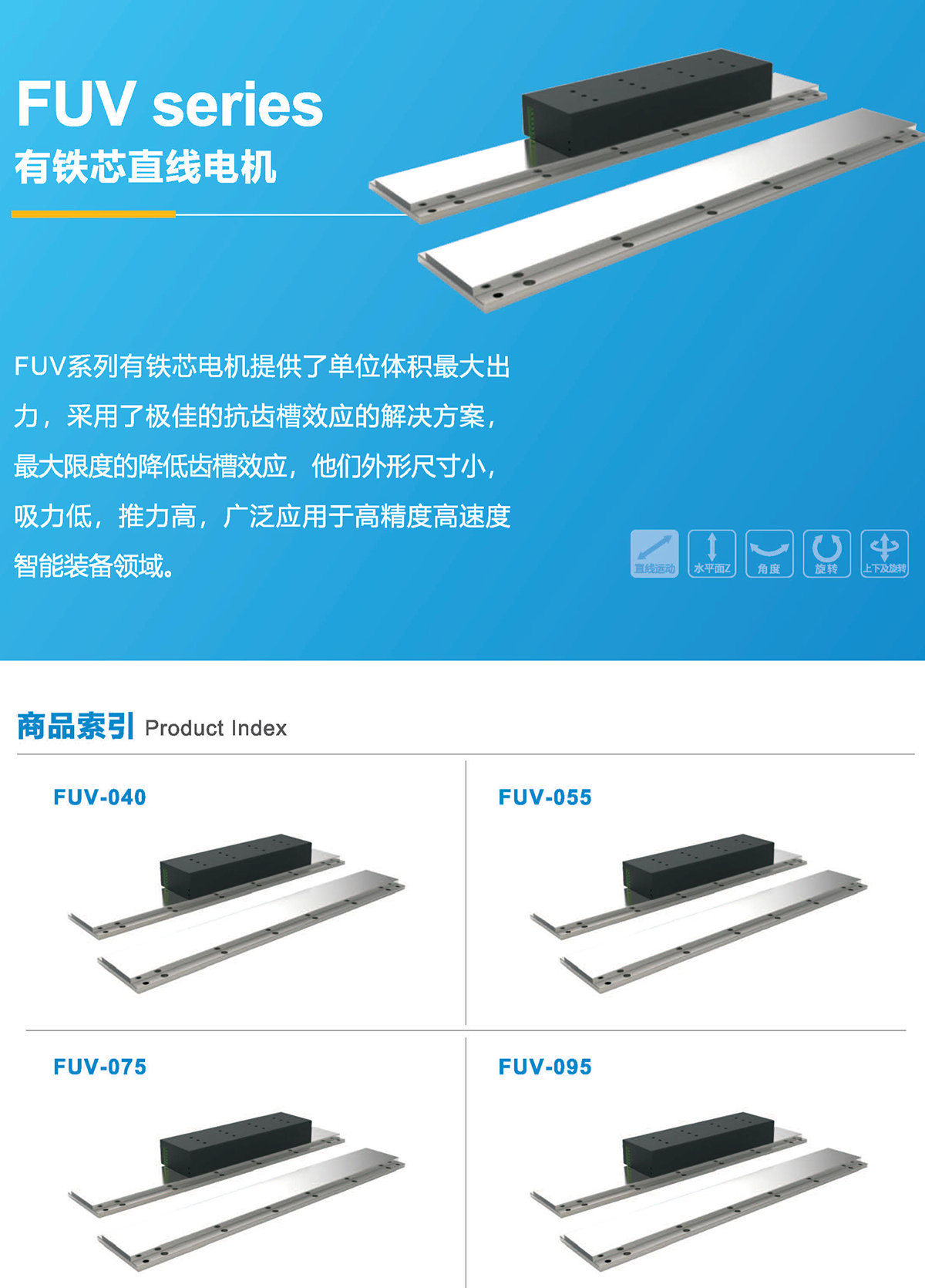 FUV系列有鐵芯電機(jī)提供了單位體積最大出力,采用了極佳的抗齒槽效應(yīng)的解決方案,最大限度的降低齒槽效應(yīng),他們外形尺寸小,吸力低,推力高,廣泛應(yīng)用于高精度高速度智能裝備領(lǐng)域。