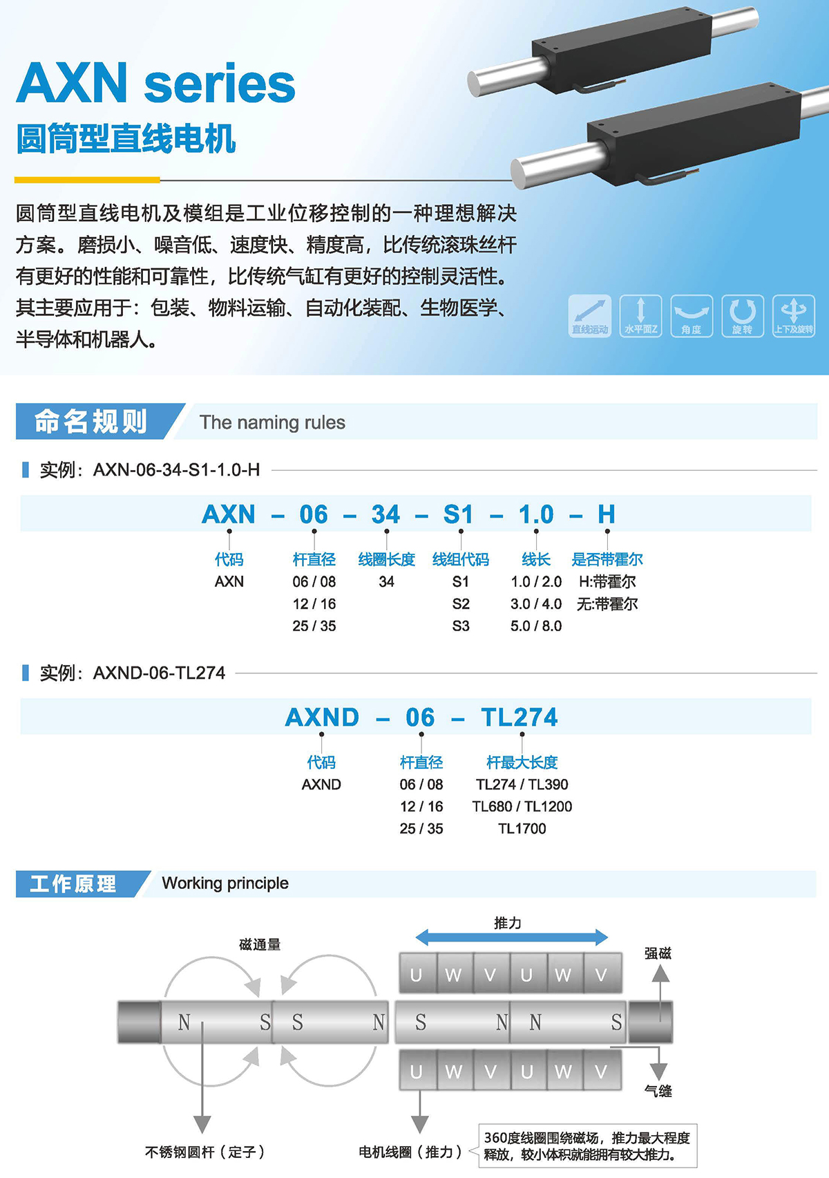 圓筒型直線電機及模組是工業(yè)位移控制的一種理想解決方案。磨損小、噪音低、速度快、精度高,比傳統(tǒng)滾珠絲桿有更好的性能和可靠性,比傳統(tǒng)氣缸有更好的控制靈活性。
