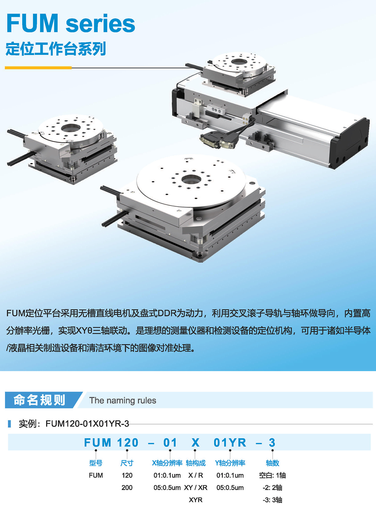 FUM定位平臺采用無槽直線電機及盤式DDR為動力,利用交叉滾子導(dǎo)軌與軸環(huán)做導(dǎo)向,內(nèi)置高分辦率光柵,實現(xiàn)XY0三軸聯(lián)動。是理想的測量儀器和檢測設(shè)備的定位機構(gòu),可用于諸如半導(dǎo)體/液相關(guān)制造設(shè)備和清潔環(huán)境下的圖像對準(zhǔn)處理。