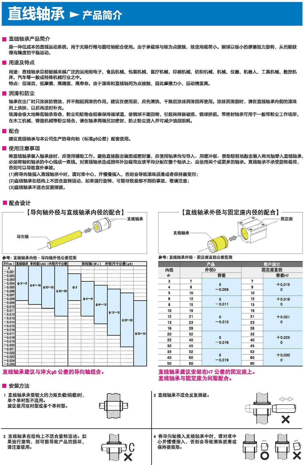 特點:低噪音、低摩擦、高精度、高壽命。由于滾珠和直線軸間為點接觸,因此摩擦力小,運動精度高。